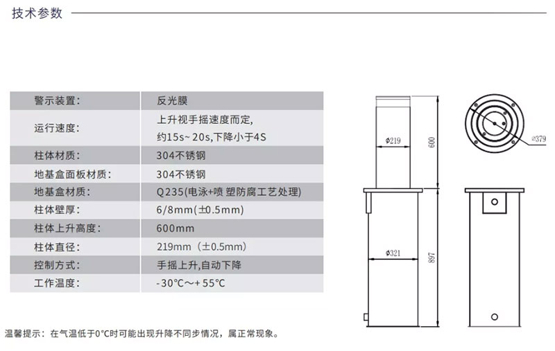 经济实用型防护,通过手摇柄上升,及手动释放下降升降地柱,纯机械结构,性价比高、稳定性高,避免了复杂的施工,可以用来管理公共或私人通道。